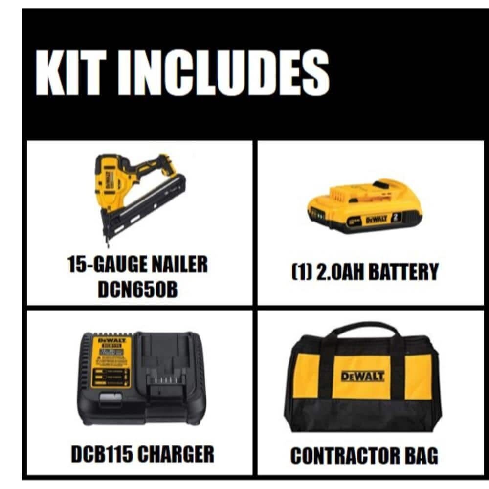 The DeWALT 20 Volt Max XR® cordless angled finish nailer tool kit includes DCB203 2.0 Amp-hours battery, DCB112 charger and a kit bag. Finish nailer is designed to drive 15 Gauge angled finish nails from 1-1/4 to 2-1/2 Inch. This tool is perfect for fastening crown molding, casing, baseboards and hardwood floor installation. It is equipped with brushless motor for increased runtime and durability. Nailer is powered by a 20 Volt Max Lithium-Ion battery, which facilitates user to use without the hassle of using gas, compressor and hose. It is great tackle both large and small jobs with the features of a pneumatic tool and the freedom of cordless. Micro nose of tool improves line of sight and precision of nail placement. It has tool-free selectable trigger for sequential or contact actuation modes and tool-free depth adjustment for precise countersinking of nails. Tool-free jam release of tool aids to clear nail jams quickly and easily. It is integrated with multi-functional LED lights to offer both workspace illumination and tool diagnostics. Integrated tool-free stall release lever resets the driver blade in the event of a stall conveniently. Nailer features adjustable belt hook for left or right attachment depending on user preference. Inline magazine ensures easy usage in multiple orientations and in tight spaces.
