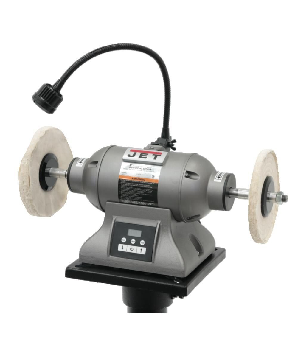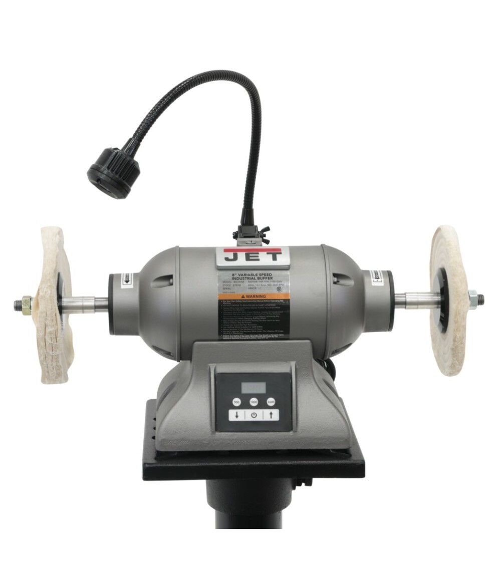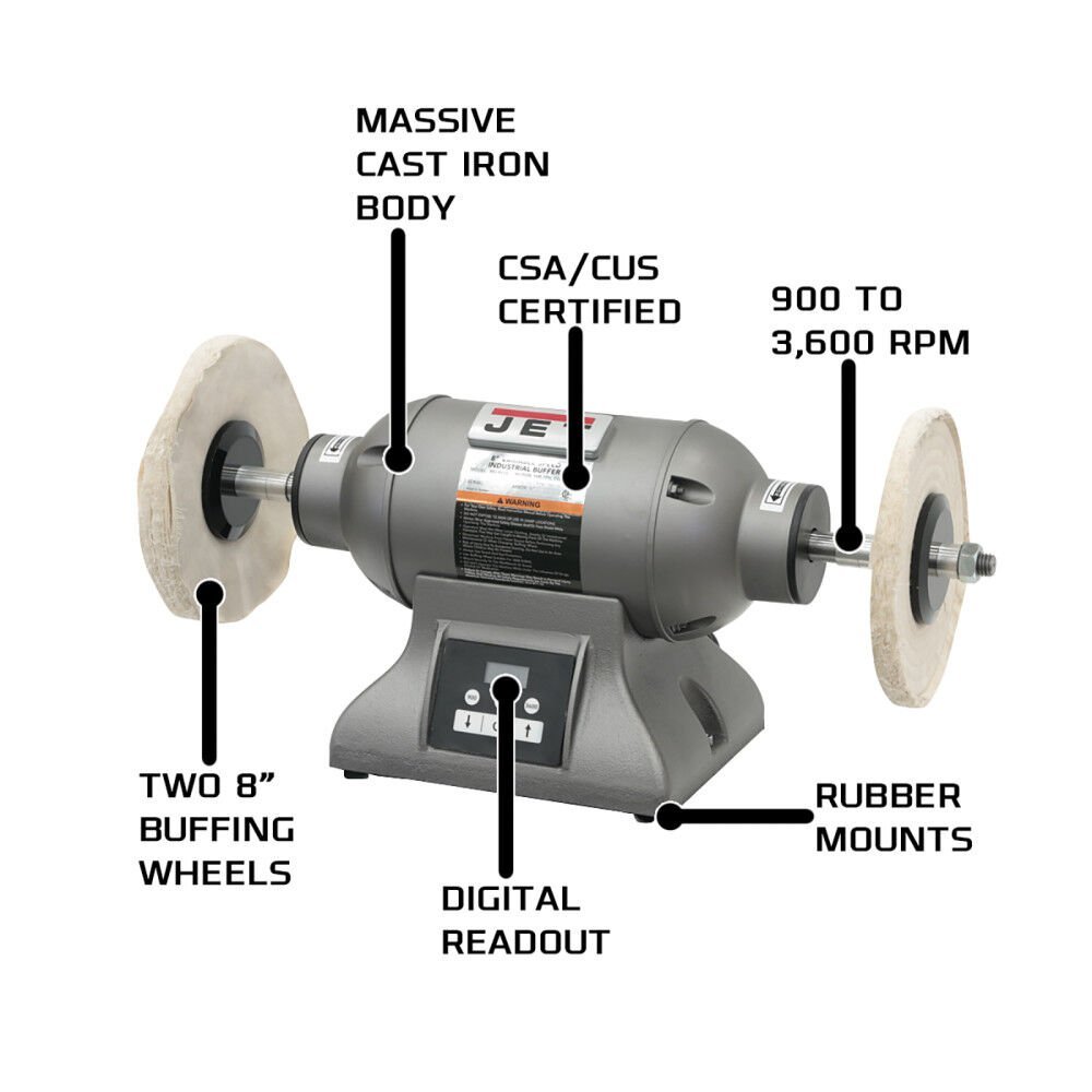 The heavy-duty one-horsepower 8-inch Variable Speed Industrial Bench Buffer is engineered with a full casted body and loaded with safety innovations. The exclusive motor stop will reduce RPM speed from 3,600 to 0 in less than 20-seconds bringing the buffing wheel to a complete stop.