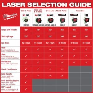 The MILWAUKEE® M12™ Green Cross Line & 4-Points Laser provides all-day runtime and the best visibility in its class. Using MILWAUKEE® M12™ REDLITHIUM™ 3.0 CP Battery (sold separately), users get 9+ hours of continuous runtime for ultimate productivity. The high-intensity green laser offers users superior visibility up to 125′ for long-range applications. The vertical and horizontal lines make alignment and level applications easy for users, while the additional 4-points allow for quick transfers from floor to ceiling and squaring applications. The integrated magnetic bracket features micro-control and pivots on the plumb point for easy and fast alignment. The amplified rare earth magnets provide a stronghold and will not slide on steel studs, while an integrated hang hole makes setup easy and efficient in any environment. As part of the industry-leading MILWAUKEE® M12™ System, this laser is compatible with all MILWAUKEE® M12™ Batteries.