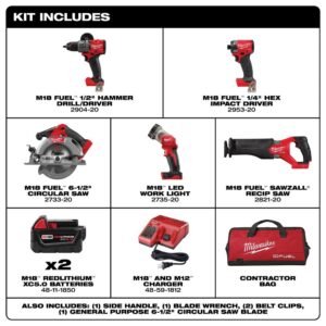 | Package Contents | (1) M18 FUEL Hammer Drill (2904-20); (1) M18 FUEL 1/4″ Hex Impact Driver (2953-20); (1) Gen 2 M18 FUEL Sawzall (2821-20); (1) M18 FUEL 6-1/2″ Circular Saw (2730-20); (1) M18 Work Light (2735-20); (2) M18 XC5.0 Battery (48-11-1850); M18 & M12 Charger (48-59-1812); Bag; (1) Side Handle; (2) Belt Clips; (1) Circular Saw Blade; (1) Blade Wrench |